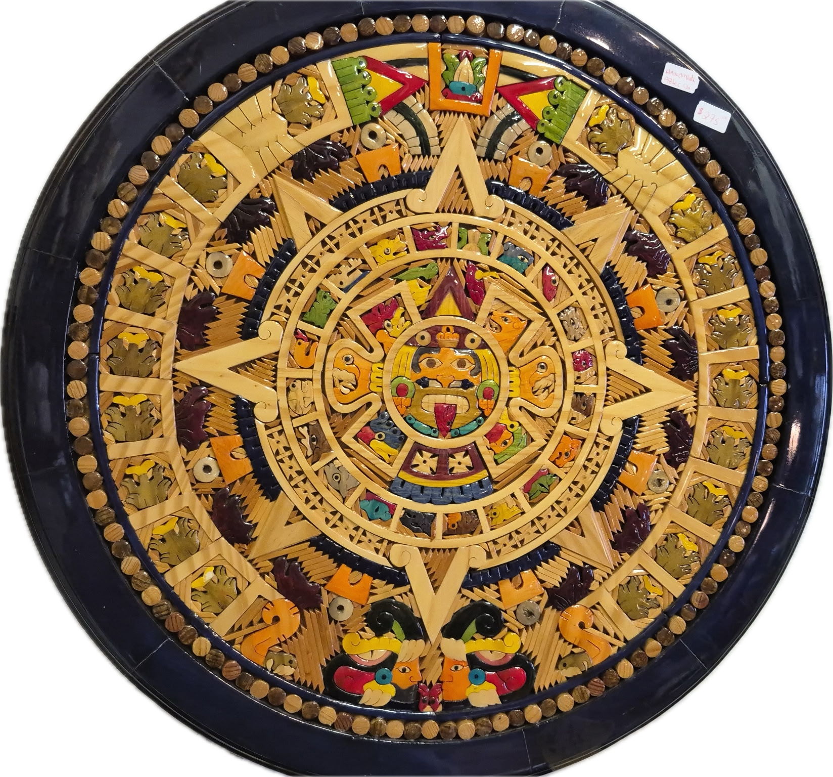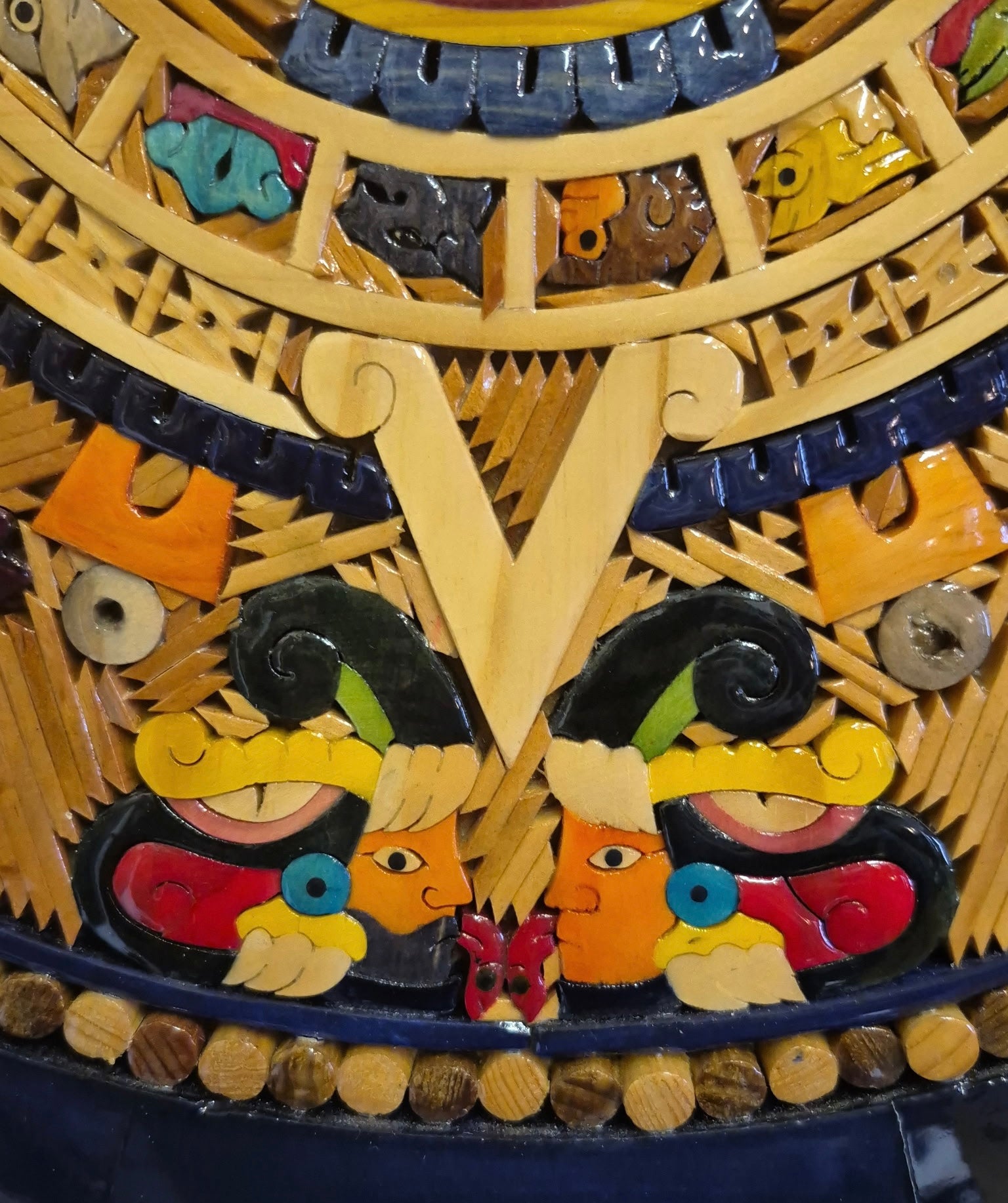 This is a handcrafted wooden replica of the Aztec Sun Stone, often called the "Aztec calendar stone".