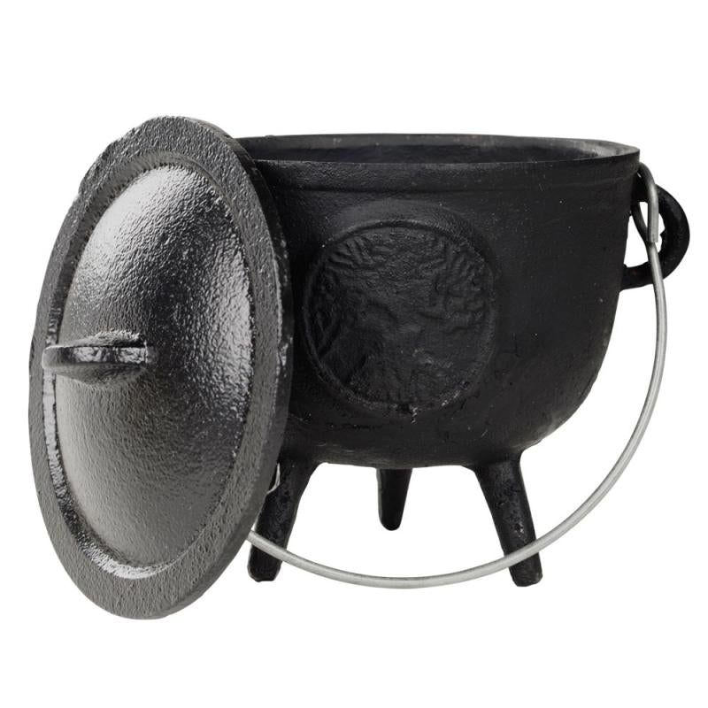 This is a Tree of Life cast iron cauldron, commonly used for burning incense, herbs, or candles, often in spiritual practices. The "Tree of Life" symbol represents growth, connection, and wisdom.